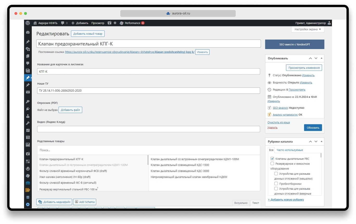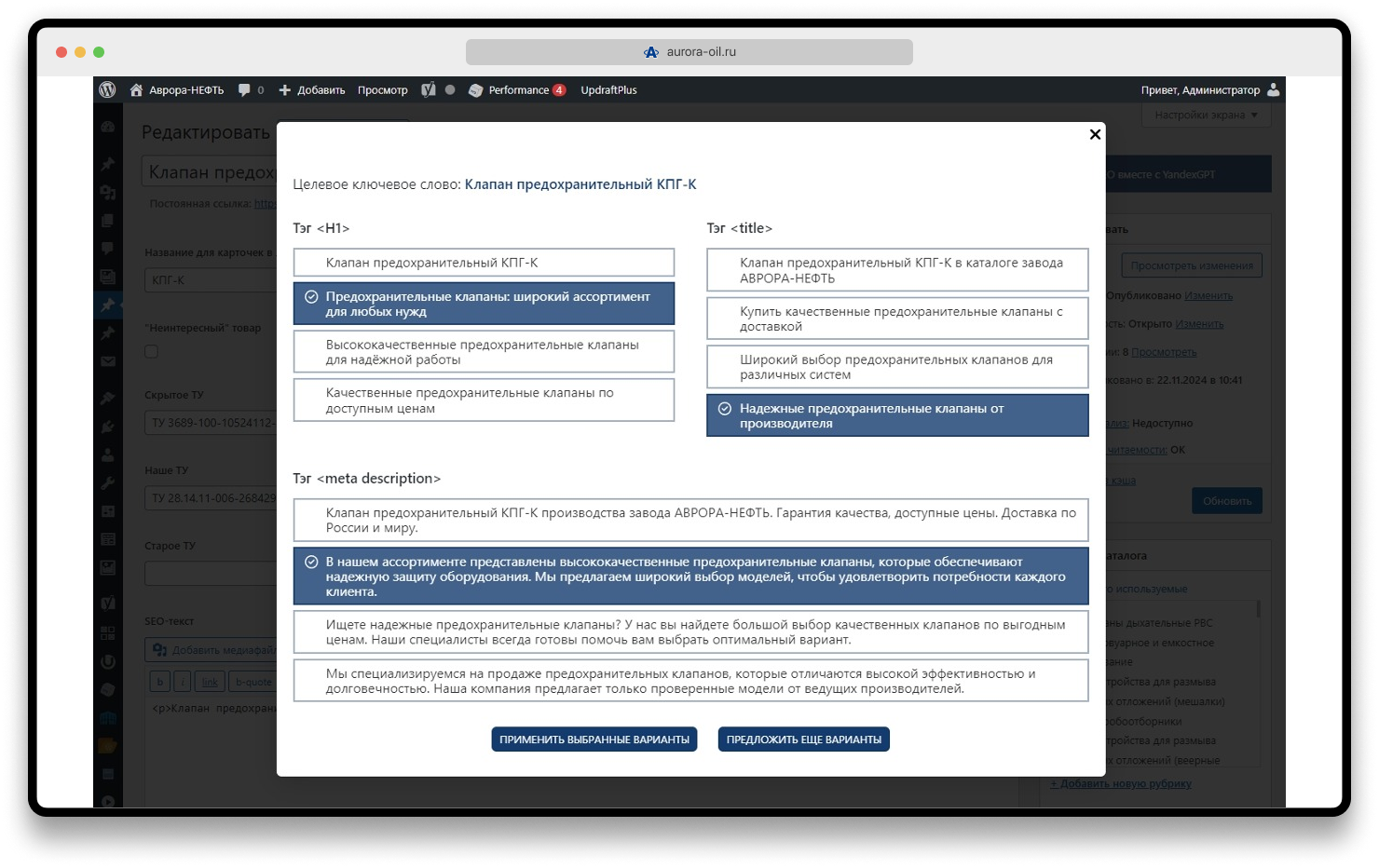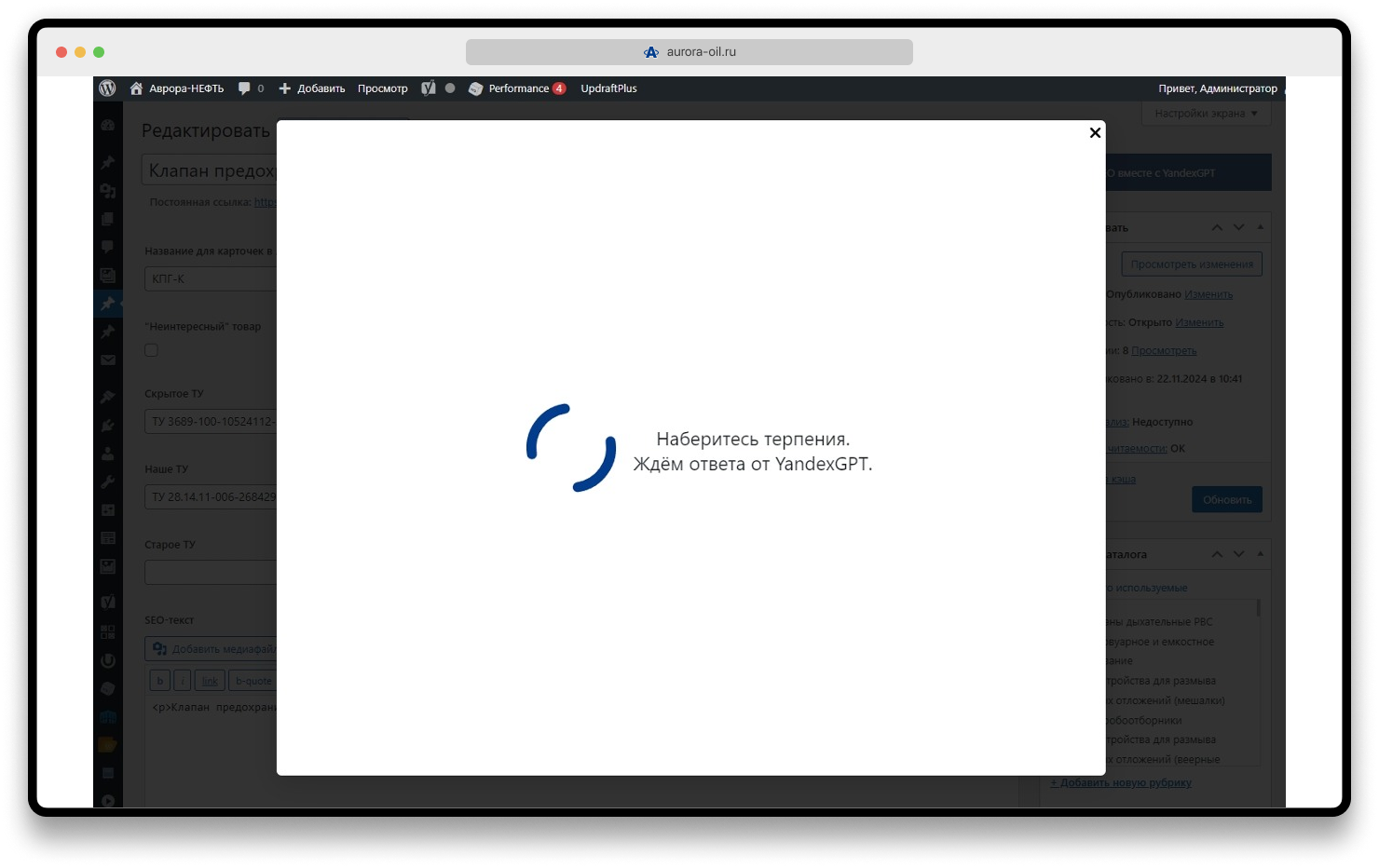 - Полученные от YandexGPT данные сохраняются в соответствующие поля Yoast, проверяется корректность записи.