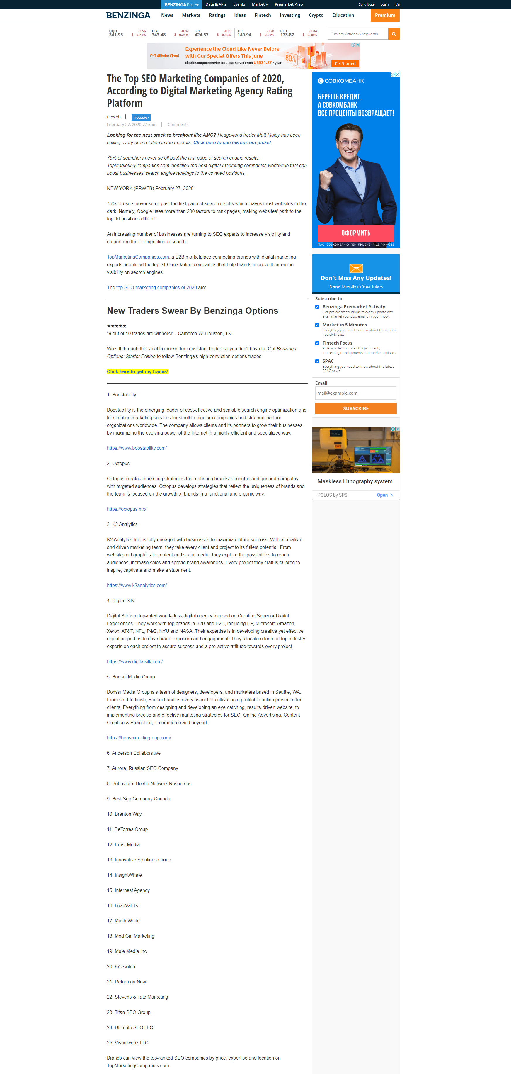 СМИ Benzinga — одно из самых популярных изданий о финансах, рынках, экономике и технологиях — опубликовало рейтинг лучших компаний, предлагающих услуги SEO. Рейтинг был составлен на основе исследования, подготовленного и проведенного порталом TopMarketingCompanies.
